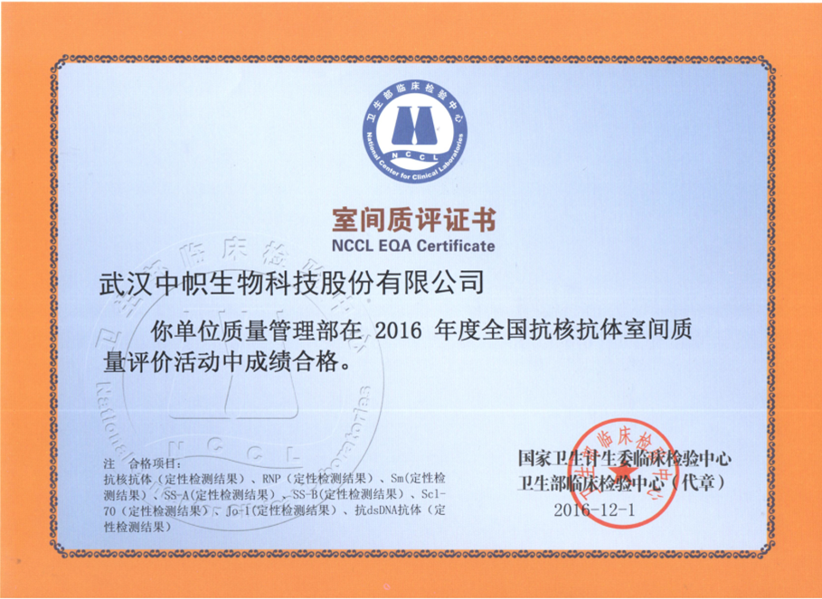 近期,公司參加衛(wèi)生部臨床檢驗(yàn)中心2016年室間質(zhì)量評(píng)價(jià)結(jié)果全部合格,獲得合格證書。檢測(cè)項(xiàng)目涉及抗核抗體、RNP、Sm、SS-A、SS-B、Sc1-70、Jo-1、抗dsDNA等。我公司自2014年以來(lái)一直參加此項(xiàng)活動(dòng),連續(xù)三年保持著較好水平。
