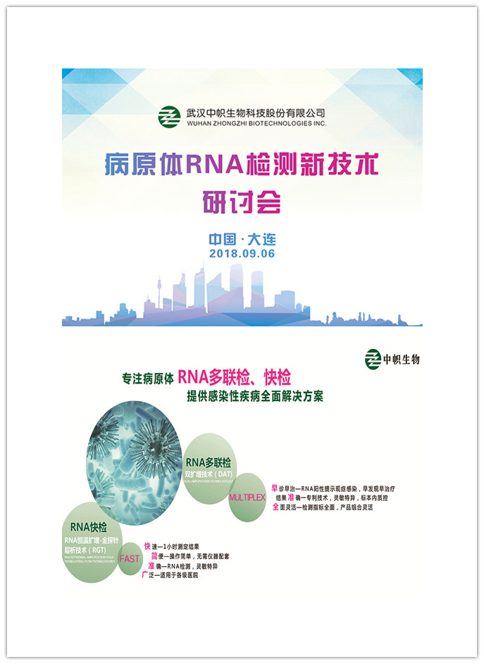 會(huì)議期間,中幟生物組織召開(kāi)了“病原體RNA檢測(cè)新技術(shù)研討會(huì)”。此次研討會(huì)有幸邀請(qǐng)到全國(guó)各地檢驗(yàn)學(xué)界的專家學(xué)者齊聚一堂,就病原體rna多聯(lián)檢、快檢兩項(xiàng)新技術(shù)展開(kāi)交流探討。研討會(huì)首先由公司領(lǐng)導(dǎo)致歡迎辭,而后對(duì)雙擴(kuò)增技術(shù)DAT-RNA多聯(lián)檢和RNA恒溫?cái)U(kuò)增-金探針層析技術(shù)RGT-RNA快檢技術(shù)及新技術(shù)應(yīng)用產(chǎn)品作詳細(xì)介紹,在場(chǎng)專家學(xué)者就DAT和RGT新技術(shù)新產(chǎn)品展開(kāi)激烈交流和探討,反響極為熱烈。