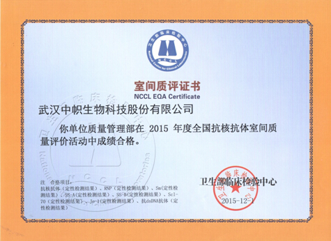 在衛(wèi)生部臨床檢驗(yàn)中心開(kāi)展的2015年度全國(guó)臨床檢驗(yàn)室間質(zhì)量評(píng)價(jià)(EQA)活動(dòng)中,公司抗核抗體項(xiàng)目圓滿通過(guò)測(cè)評(píng),獲得室間質(zhì)評(píng)合格證書。